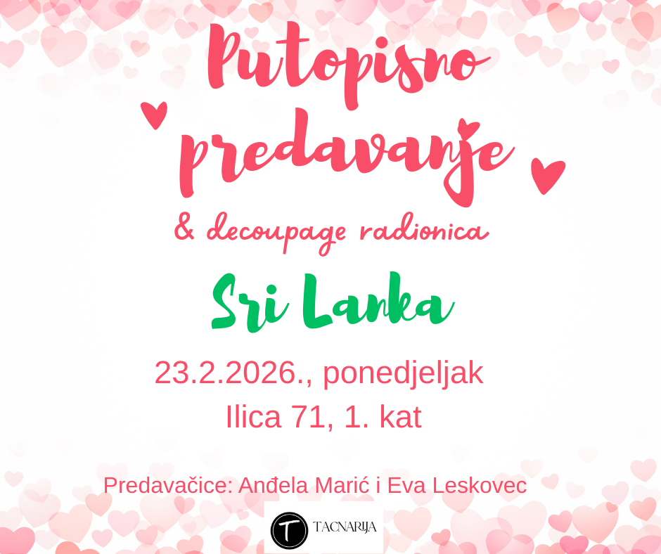 Mjesec je darivanja i ljubavi, a najljepši poklon koji možete pokloniti dragoj osobi je iskustvo i znanje. Zato iskoristite priliku i povedite sa sobom najdražu osobu na putopisno predavanje i decoupage radionicu o Sri lanci! Saznajte iz prve ruke na što treba paziti dok ste u Sri Lanci i istražite svoje kreativne vještine u decoupage radionici nakon predavanja! Prijaviti se možete putem maila ili kontakt forme. Vidimo se u Tacnariji!